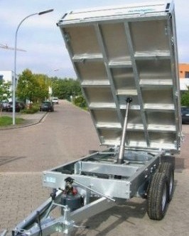 Hier kann die Ladefläche hydraulisch angehoben werden, um die Ladung zeit- und kraftsparend abzukippen. Die meisten Modelle sind wahlweise mit einer Handpumpe oder mit Elektropumpe lieferbar, wobei die Stromversorgung unabhängig vom Zugwagen über eine eingebaute Batterie erfolgt.